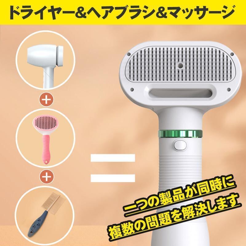ペットのシャンプー後のお手入れを快適にする、ブラシとドライヤーが一体になった便利なアイテムです。片手で乾燥とブラッシングが同時に行えるため、時間と手間を大幅に軽減。絡まった毛をほぐしながら乾かし、ふわふわで滑らかな仕上がりに導きます。3段階の温度調節機能と過熱防止機能も備え、ペットに優しく、安心してお使いいただけます。使いやすさを追求した人間工学デザインも魅力です。