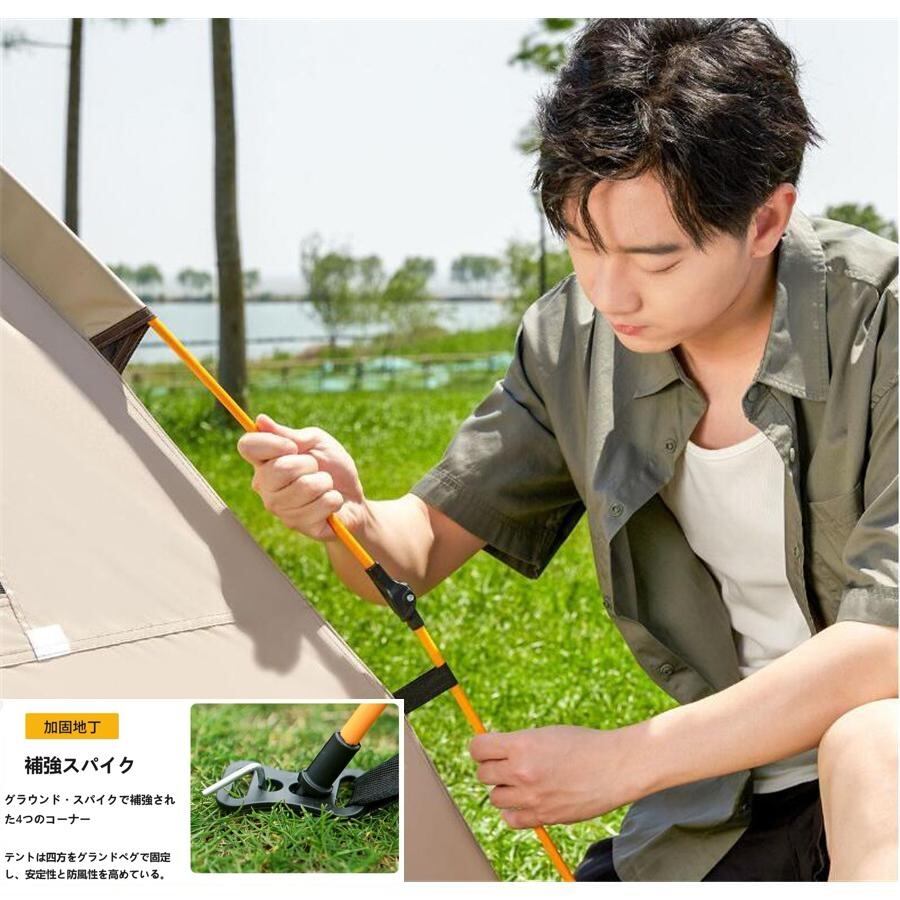 ワンタッチで簡単に設営できる、3~4人用のフルクローズドームテントです。広々とした室内空間は、ご家族やご友人と快適に過ごせます。耐水圧3000mmの防水性能とシルバーコーティングによるUVカット機能で、急な雨や強い日差しからも守ります。フルクローズにすればプライバシーも確保でき、キャンプやピクニック、フェスなど様々なアウトドアシーンで活躍します。収納時はコンパクトにまとまり、持ち運びも簡単です。